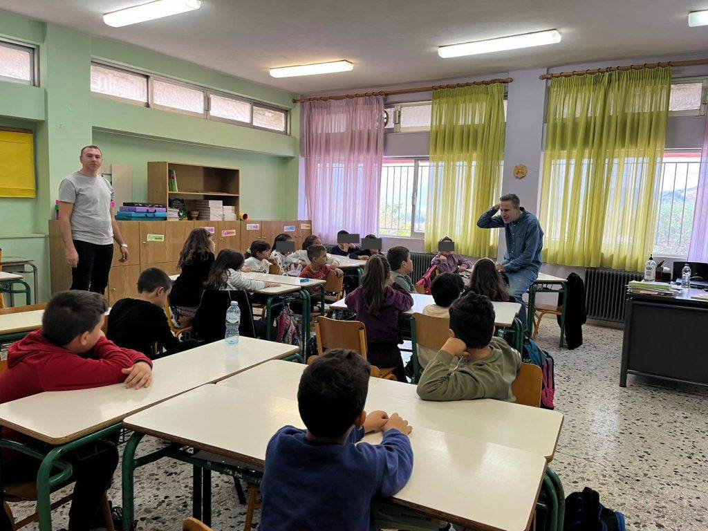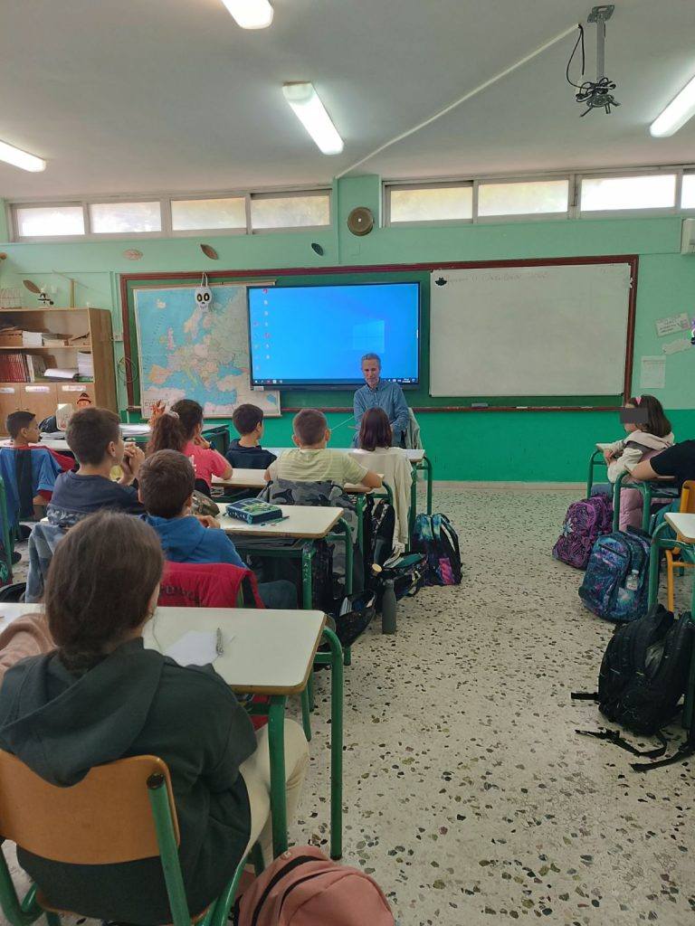 Την Παρασκευή 17 Οκτωβρίου είχαμε τη χαρά και την τιμή να υποδεχθούμε στο σχολείο μας τον αγαπημένο συγγραφέα Χρήστο Δασκαλάκη. Ο συγγραφέας επισκέφθηκε όλες τις τάξεις ξεχωριστά, μίλησε με τα παιδιά, άκουσε τις σκέψεις τους και απάντησε με χαρά στις ερωτήσεις τους. Πριν από την επίσκεψη, κάθε τάξη είχε γνωρίσει και δουλέψει τα βιβλία του. Η Α΄ και η Β΄ τάξη παρουσίασαν το βιβλίο «Η χιονονιφάδα που αγάπησε το καλοκαίρι», με ζωγραφιές, συνέντευξη από τον συγγραφέα και παιχνίδια, όπου ανακάλυψαν μόνοι τους τη μαγεία της γνώσης.Η Γ΄ και Δ΄ τάξη ασχολήθηκαν με το έργο «Μια τρίχα, μια γραμμή». Δραματοποίησαν το βιβλίο, έπαιξαν με ερωτήσεις και παρουσίασαν τη δική τους έκθεση ζωγραφικής. Ο ήρεμος και γλυκός τρόπος του συγγραφέα κέρδισε αμέσως τα παιδιά, που άκουγαν με προσοχή και μοιράστηκαν τις δικές τους σκέψεις και εμπειρίες.Η Ε΄ και η ΣΤ΄ τάξη διάβασαν και παρουσίασαν το συγκινητικό βιβλίο «Το Γονεοτροφείο». Αναλύοντας τους ήρωες του βιβλίου, προέκυψαν βαθύτερες συζητήσεις για τις αξίες και τις σχέσεις της ζωής, για τη φιλία, τη διαφορετικότητα και την αποδοχή.